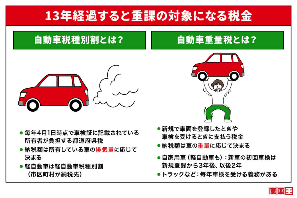 新規登録から13年が経過すると、自動車税種別割と自動車重量税の納税額がそれぞれ上がります。